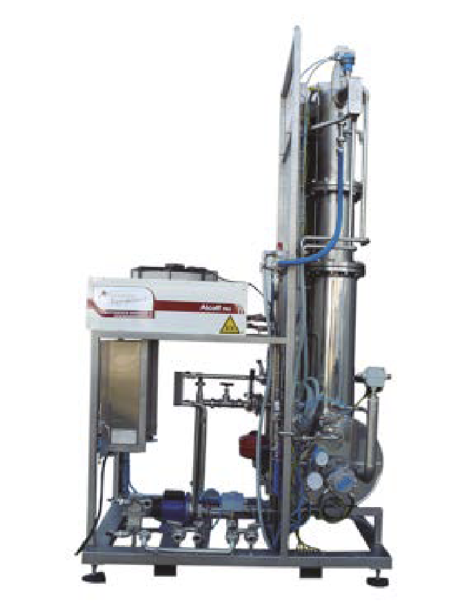 Columna de destilación autorizada para producir alcohol vínico con pureza de 85 – 90 % de alcohol por volumen de permeado obtenido a través de osmosis. Permite al momento de desalcoholizar poder volver al agua vegetal al vino sin tener que cambiar el equilibrio ácido – base.